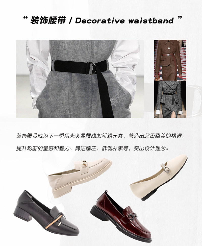 用腰帶裝飾是鞋服行業(yè)的一種新式設(shè)計(jì)元素,突出整體格調(diào)美感和氣質(zhì)的展現(xiàn),給予成熟優(yōu)雅的美。